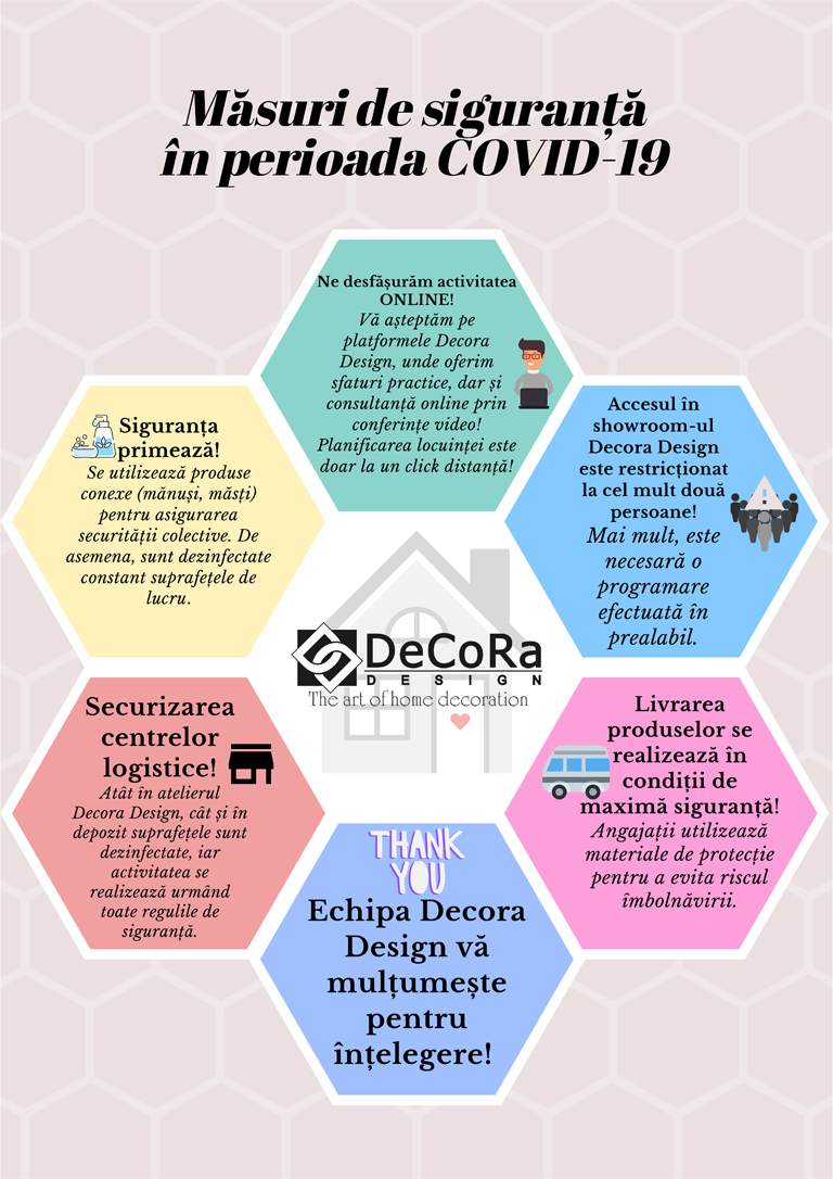 Am implementat măsuri sporite de siguranță în vederea luptei contra COVID-19, tocmai pentru a crea un loc securizat. În acest sens, o parte a angajaților Decora Design lucrează remote, iar ceilalți utilizează materiale conexe (echipamente compuse din măști, mănuși) pentru a evita riscul îmbolnăvirii. De asemenea, toate suprafețele sunt DEZINFECTATE, iar la intrarea în showroom există produse antibacteriene pentru o protecție suplimentară!